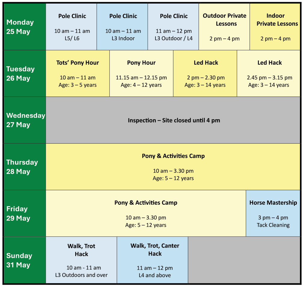 With Pony & Activities Camp Days, Pony Hour, Led Hacks and Tots’ Pony Hour that are ideal for children who are new to horse riding, as well as children who have ridden before, it’s going to be a busy Half Term at the Equestrian Centre!   The fun continues with Pole Clinics, Hacks, and private lessons for our graded, regular riders!